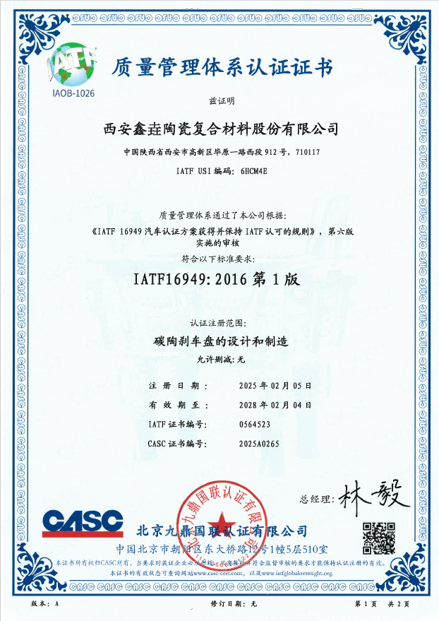 近日,西安鑫垚陶瓷復合材料股份有限公司收到了北京九鼎國聯認證有限公司下發(fā)的IATF 16949汽車質量管理體系認證證書,認證注冊范圍為“碳陶...